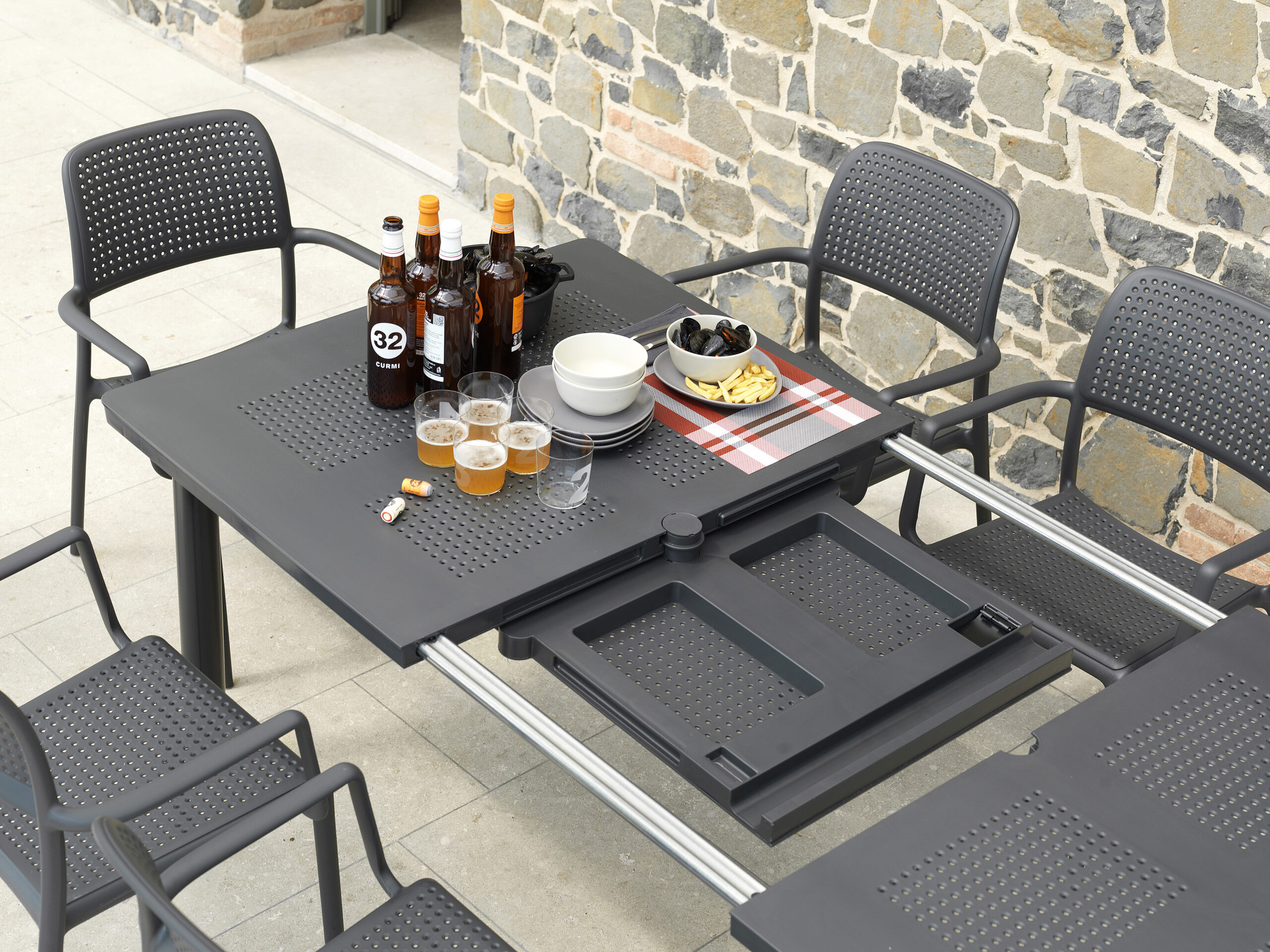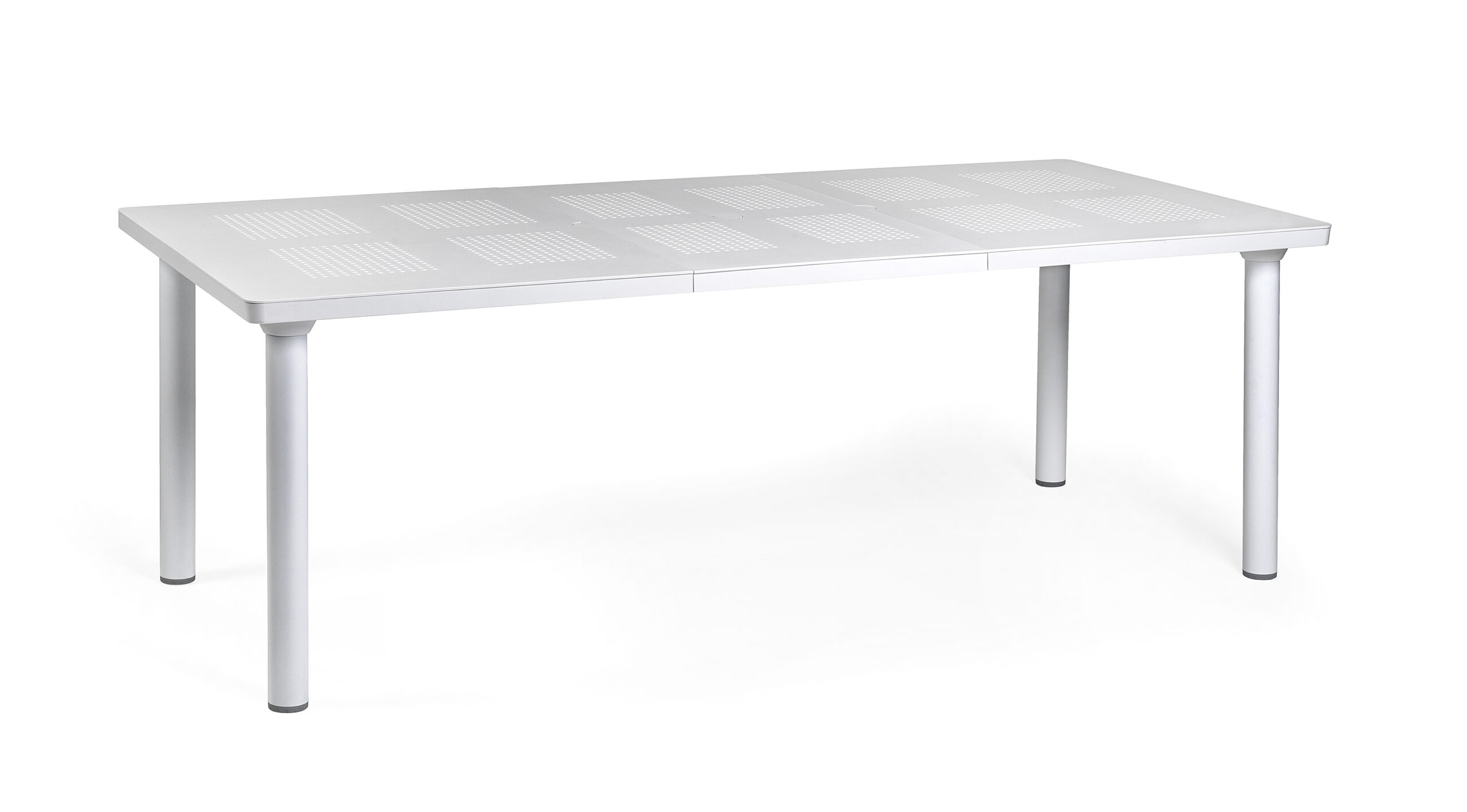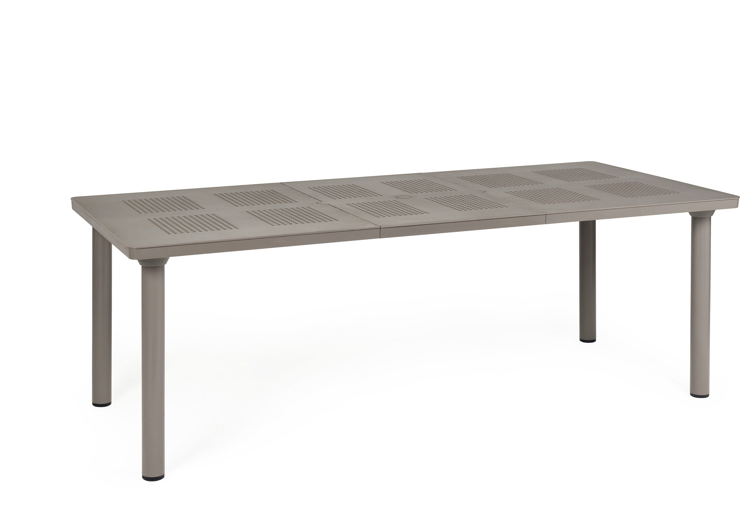 Mesa extensible de resina con fibra de vidrio y patas de aluminio. Igual a la mesa Libeccio, solo cambia la pata que es cuadrada en este modelo.