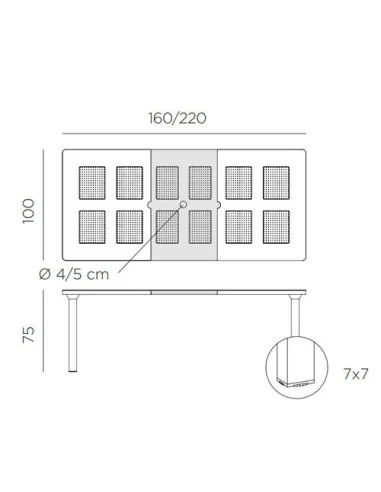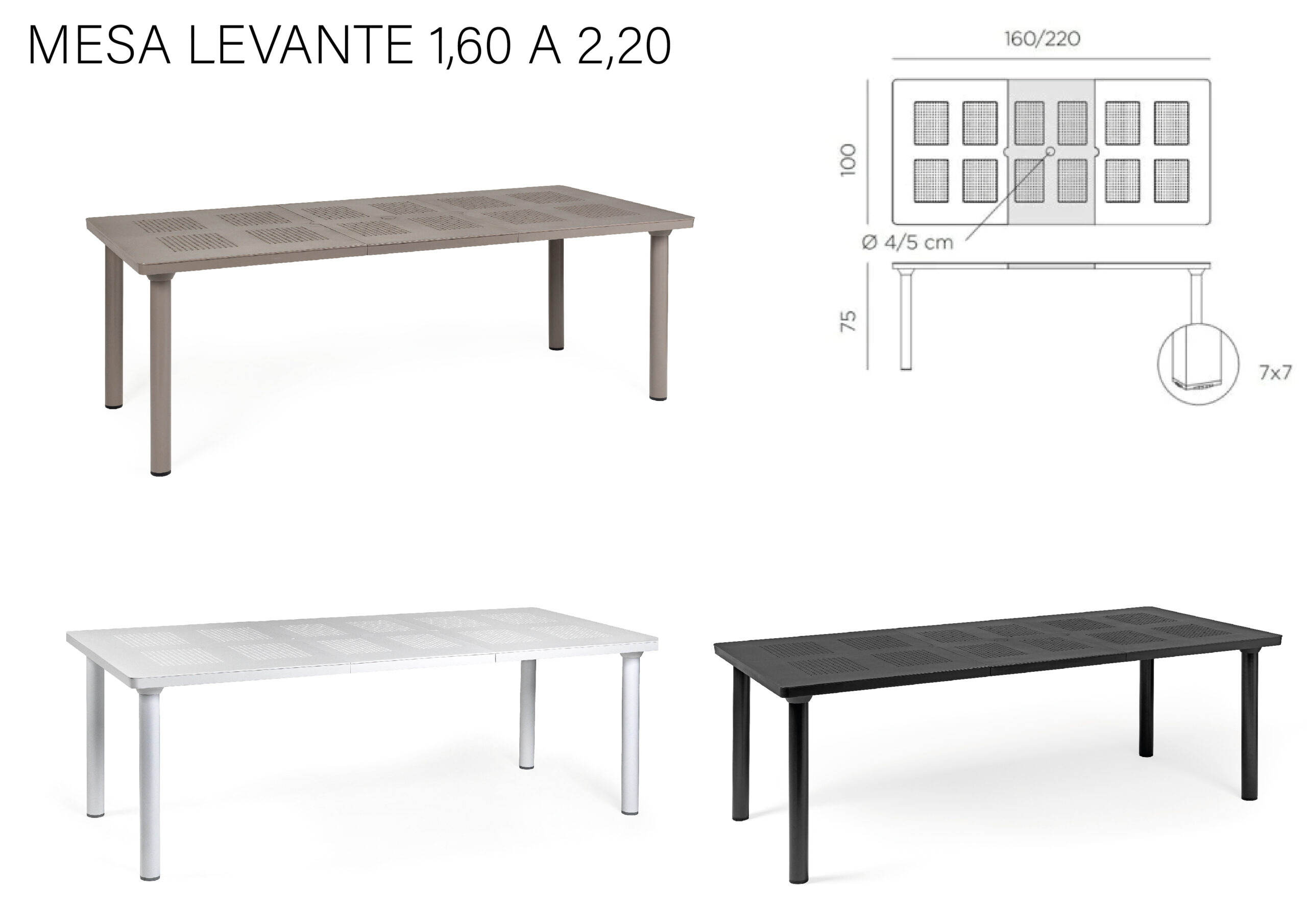 Diseñada para exterior, su tablero presenta un delicado diseño calado que aporta estilo y funcionalidad. Incorpora una extensión oculta bajo el tablero, que permite ampliar su largo hasta 2,20 metros. El mecanismo es simple: se despliega la extensión, se encastra y se asegura fácilmente con trabas.