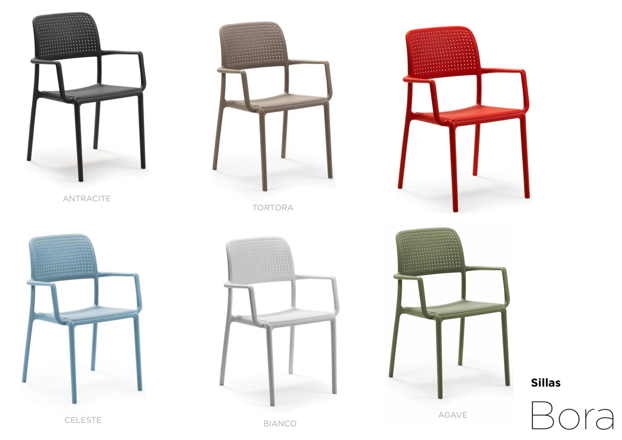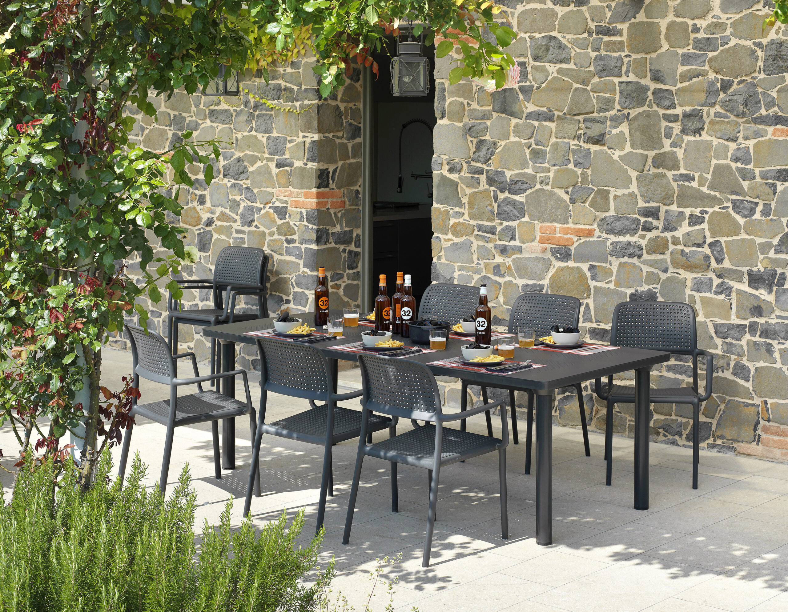 Modelos como el sillón Bora o la silla Bora complementan perfectamente esta mesa, ideal para terrazas, jardines o galerías.