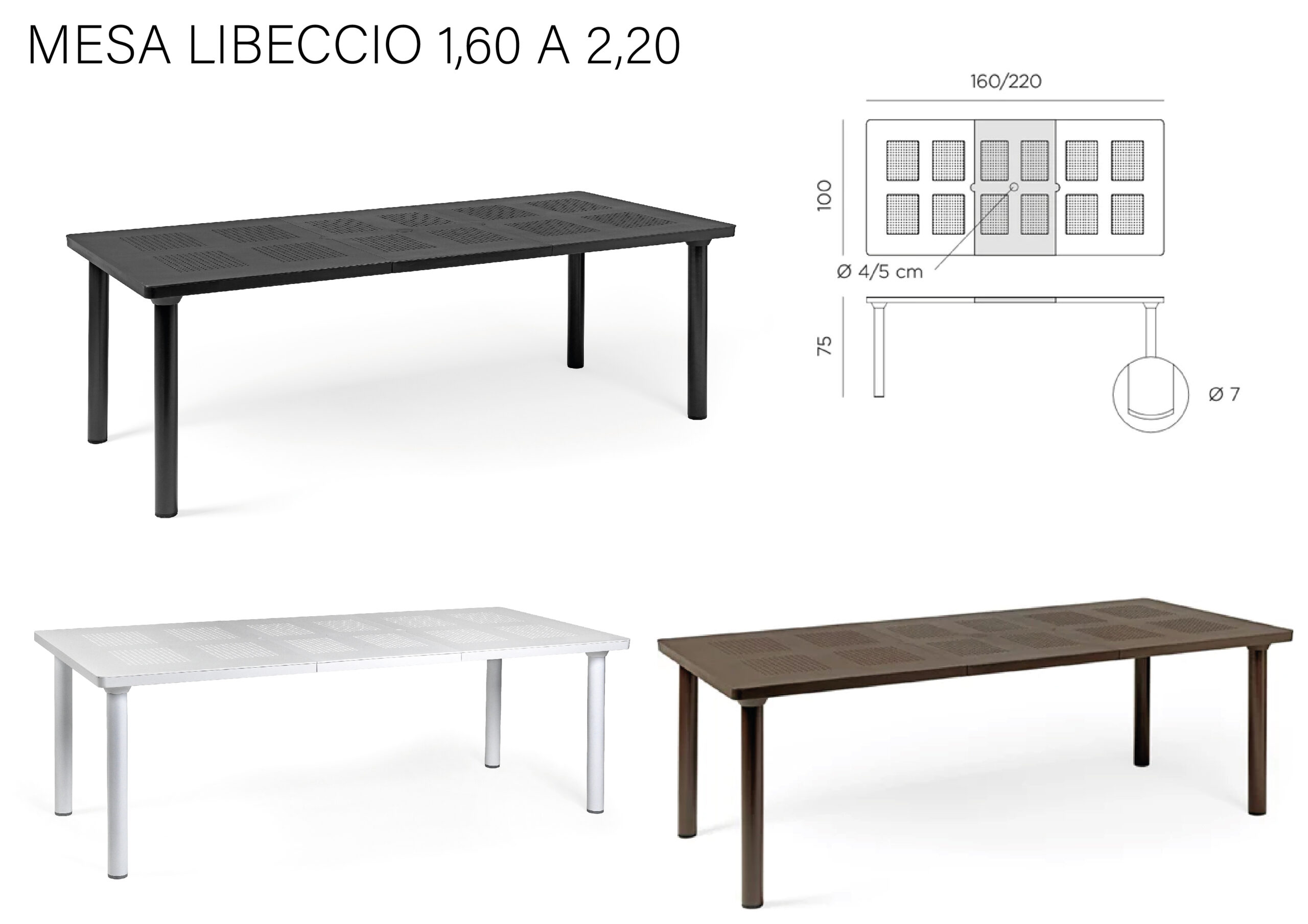 Diseñada para exterior, su tablero presenta un delicado diseño calado que aporta estilo y funcionalidad. Incorpora una extensión oculta bajo el tablero, que permite ampliar su largo hasta 2,20 metros. El mecanismo es simple: se despliega la extensión, se encastra y se asegura fácilmente con trabas.