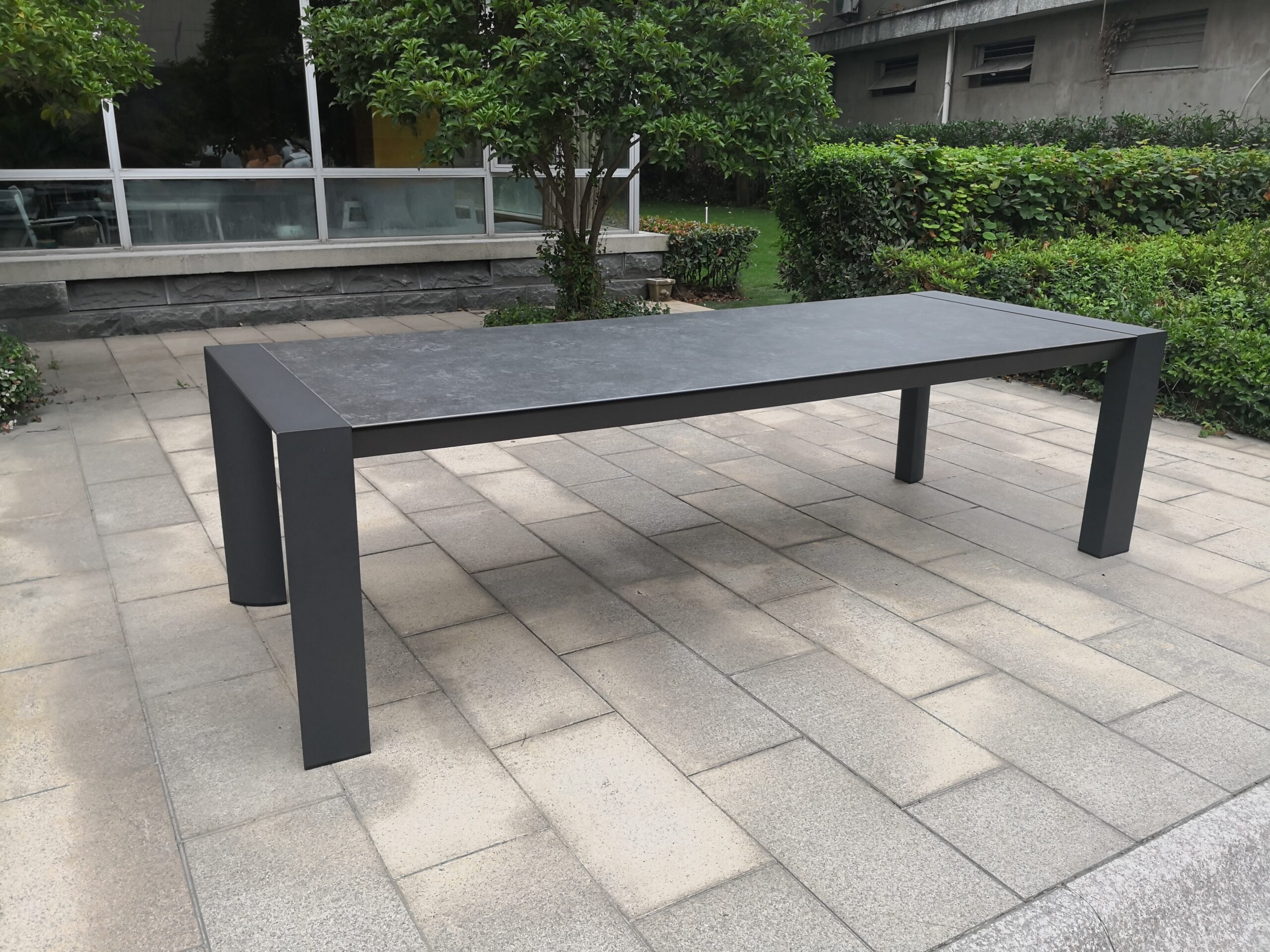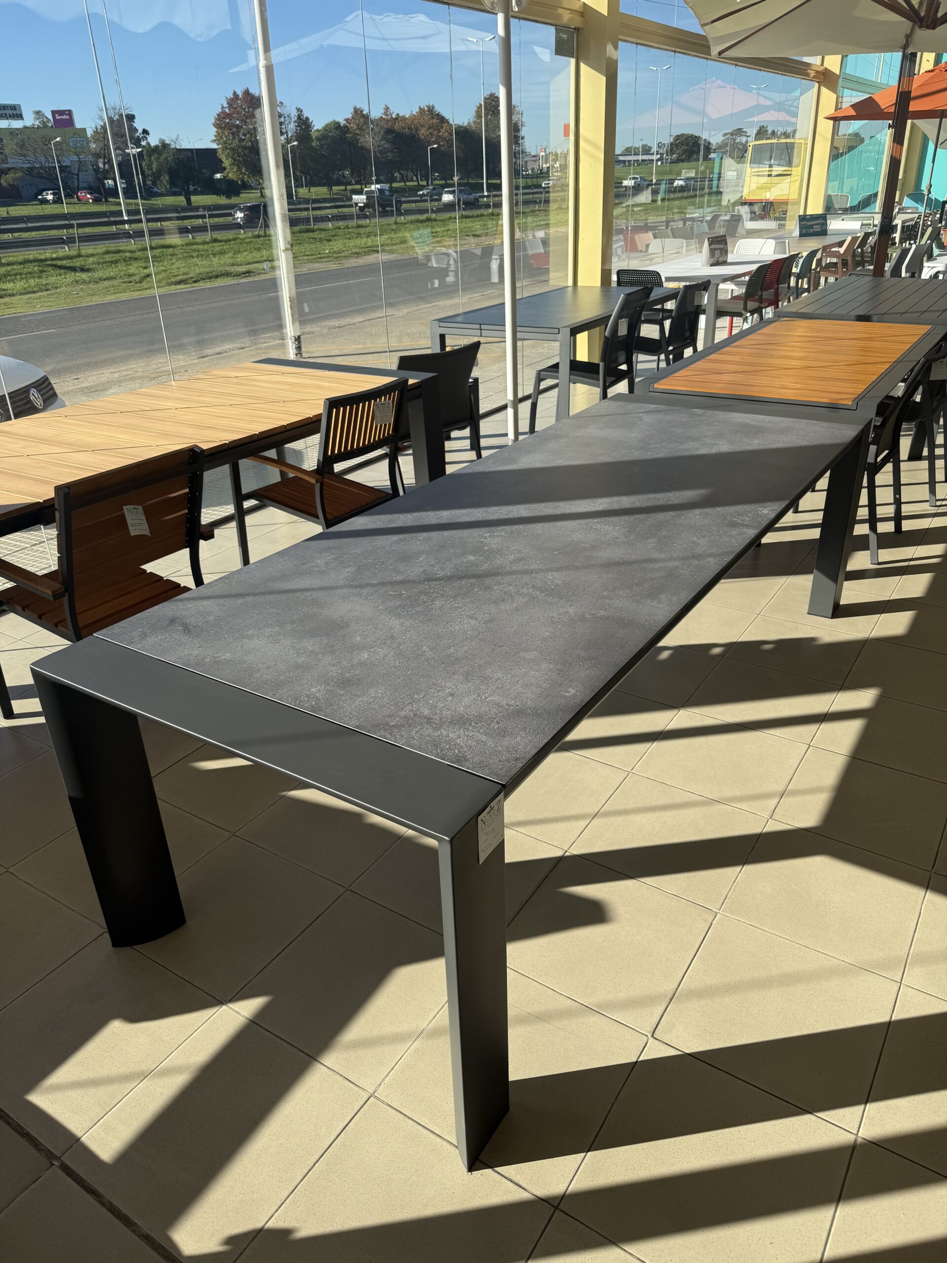 Mesa con estructura de aluminio color antracita con tapa de vidrio templado, pintada símil cerámica.